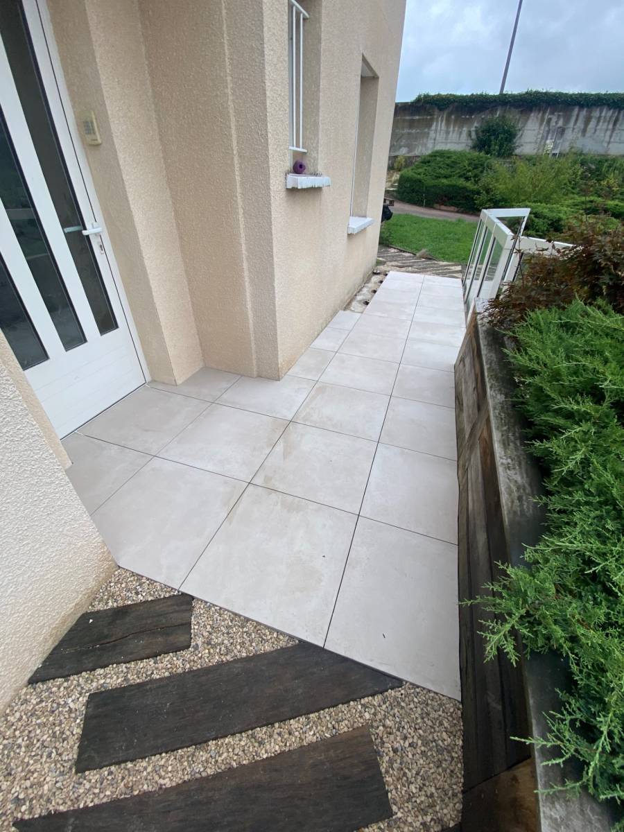 Les dalles sont ensuite posées une par une, assurant un alignement impeccable, un excellent drainage et une finition professionnelle.